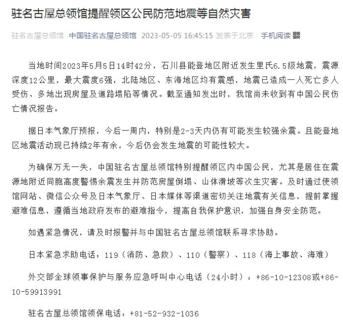 為確保萬無一失,中國駐名古屋總領(lǐng)館特別提醒領(lǐng)區(qū)內(nèi)中國公民,尤其是居住在震源地附近同胞高度警惕余震發(fā)生并防范房屋倒塌、山體滑坡等次生災(zāi)害。及時(shí)通過使領(lǐng)館網(wǎng)站、微信公眾號及日本氣象廳、日本媒體等渠道密切關(guān)注地震有關(guān)信息,提前掌握避難信息,遵循當(dāng)?shù)卣l(fā)布的避難指令,提高自我保護(hù)意識,加強(qiáng)自身安全防范。