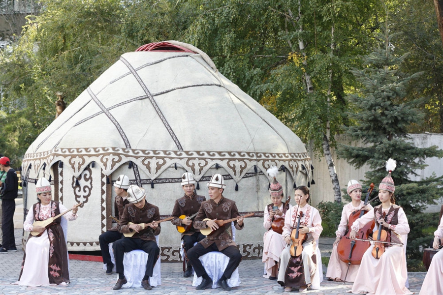 ↑身穿民族服飾的演奏者在吉爾吉斯斯坦首都比什凱克用傳統(tǒng)樂器合奏音樂。