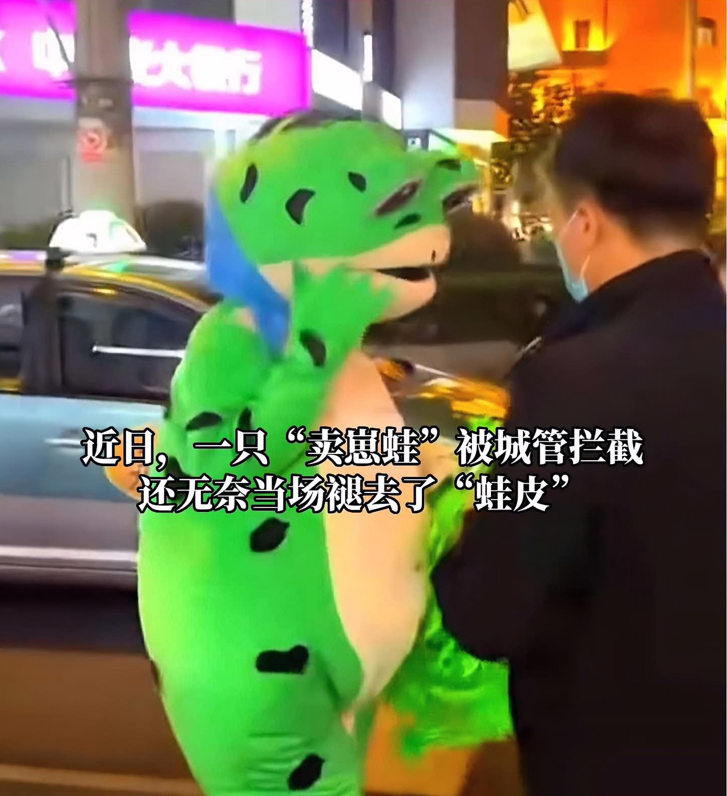 最近,“網(wǎng)紅賣崽青蛙上海落網(wǎng)”在網(wǎng)上引起熱議。在上海街頭,一只“賣崽青蛙”被城管攔截,還無奈當場褪去了“蛙皮”。