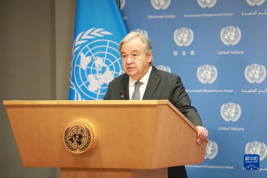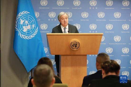 5月17日,在位于紐約的聯(lián)合國總部,聯(lián)合國秘書長古特雷斯在記者會上講話。新華社記者謝鍔攝