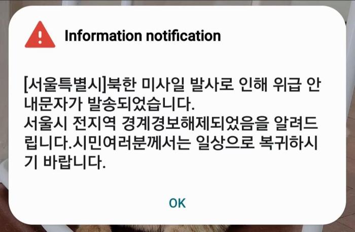 “今天6時(shí)32分首爾地區(qū)發(fā)布警戒警報(bào)。請(qǐng)各位國(guó)民做好躲避準(zhǔn)備,讓兒童和老弱者優(yōu)先躲避?!碑?dāng)天清晨,首爾市民收到這條危急災(zāi)害通知,手機(jī)同時(shí)響起警笛聲。
