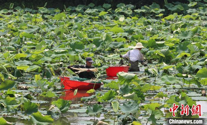 5月23日,武漢蔡甸藕農(nóng)正在荷塘里“抽”藕帶。 中新社記者 張暢 攝