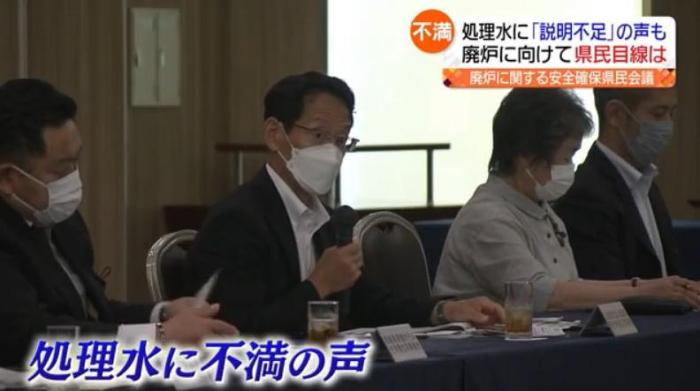 當?shù)貢r間13日下午,日本福島縣民眾召開會議,參加者針對日本政府計劃在今夏正式向大海排放核污水一事表示不滿。圖片來源:福島中央電視臺視頻截圖