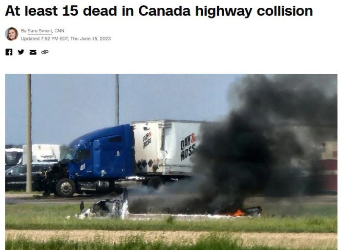 曼尼托巴省警官羅布·希爾表示,一輛載有大約25人的巴士在交叉路口與一輛半掛卡車相撞,至少15人確認死亡,另有大約10人被送往醫(yī)院。希爾補充說,巴士上大多數(shù)是老年乘客。