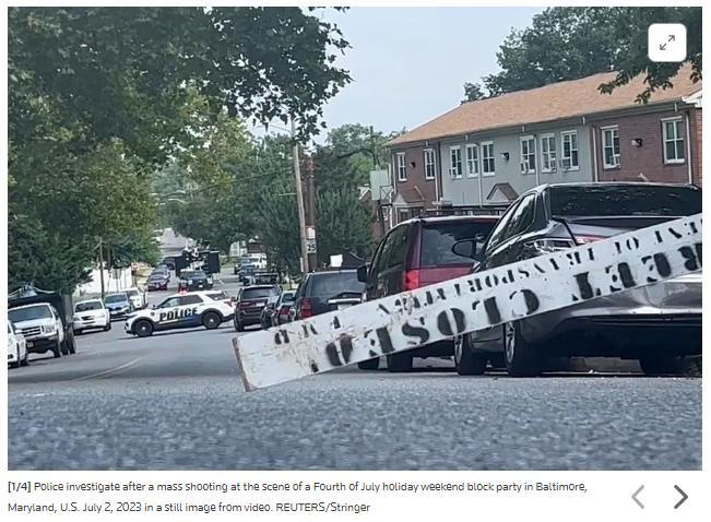 當?shù)貢r間7月2日凌晨,美國馬里蘭州巴爾的摩的一場社區(qū)派對結(jié)束后,發(fā)生了大規(guī)模槍擊事件,造成2人死亡,28人受傷,其中包括14名未成年人。圖片來源:路透社報道截圖
