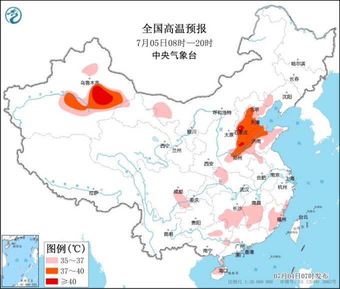 高溫方面,受降雨影響華北大部高溫天氣得到短暫緩解,明天起(5日)京津冀及黃淮等地高溫將再度發(fā)展加強,河北大部、北京、天津、山東北部、河南中北部等地日最高氣溫可達(dá)37~39℃,部分地區(qū)超過40℃。請公眾注意做好防曬降溫措施,盡量減少外出和戶外活動時間,及時補充水分,警惕高溫引發(fā)的中暑。