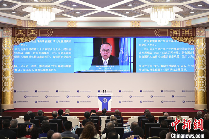 7月10日,全球共享發(fā)展行動論壇首屆高級別會議在北京開幕。聯(lián)合國副秘書長李軍華在開幕式作視頻致辭時指出,實施2030年可持續(xù)發(fā)展議程的時間框架已過半,但只有約12%的可持續(xù)發(fā)展目標(biāo)有望在2030年之前實現(xiàn),聯(lián)合國呼吁各會員國加大投入,為有需要的國家增加可負(fù)擔(dān)的長期發(fā)展融資。 中新社記者 田雨昊 攝