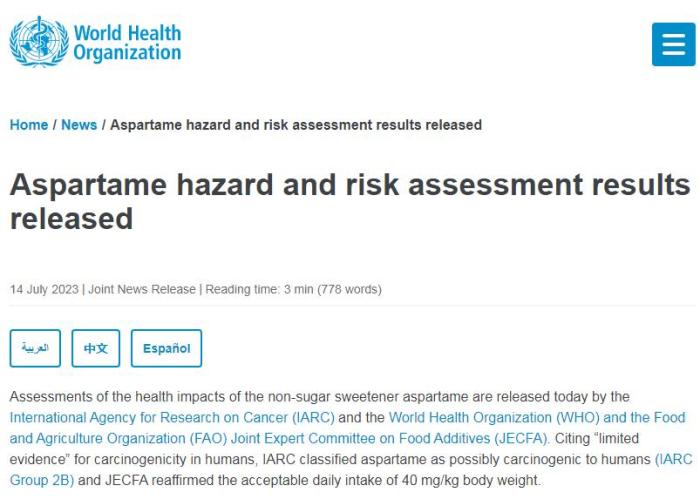 近期以來,“阿斯巴甜致癌”爭議引起廣泛關(guān)注。14日,世衛(wèi)組織官網(wǎng)上發(fā)布消息,國際癌癥研究機構(gòu)(IARC)、世界衛(wèi)生組織和聯(lián)合國糧食及農(nóng)業(yè)組織(FAO)食品添加劑聯(lián)合專家委員會(JECFA)發(fā)布了阿斯巴甜對健康影響的評估結(jié)果。