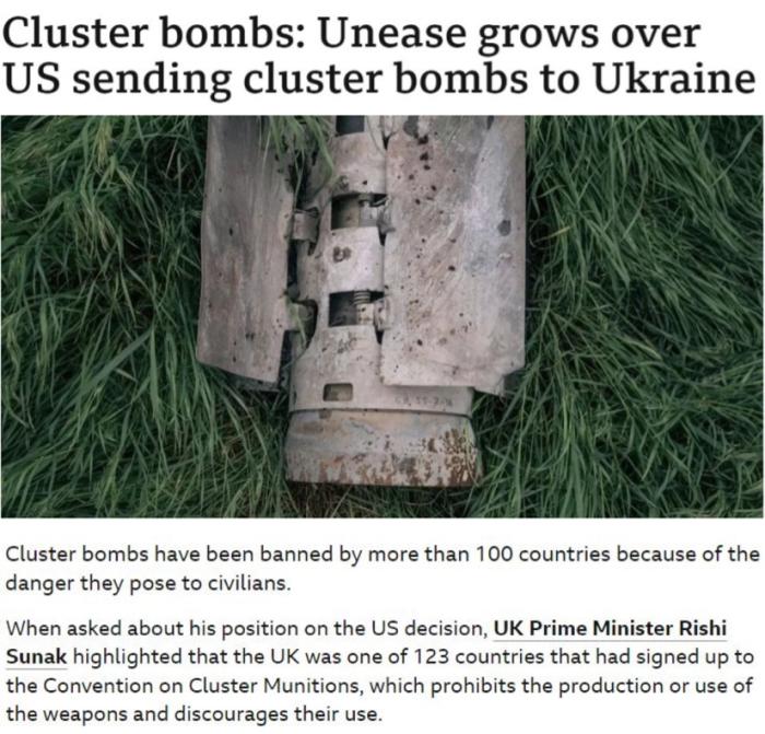 △英國(guó)廣播公司:集束彈藥因其對(duì)平民構(gòu)成的長(zhǎng)期風(fēng)險(xiǎn),已被全世界上百個(gè)國(guó)家禁用。就連一向積極軍援烏克蘭的英國(guó),也“不鼓勵(lì)”美國(guó)提供這種大殺傷力武器。
