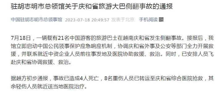 據(jù)越方初步通報,事故已造成4人死亡,8名重傷人員已轉(zhuǎn)運至慶和省綜合醫(yī)院搶救,其余輕傷人員就近送當(dāng)?shù)蒯t(yī)院治療。