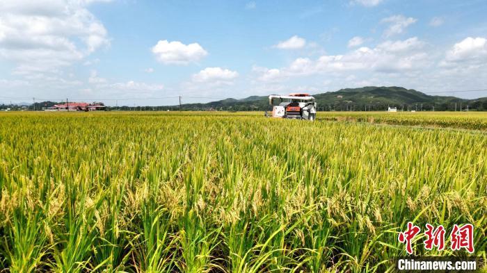 中新網(wǎng)福建長汀7月17日電 (朱芳彬 丘偉華)眼下,位于福建省龍巖市長汀縣河田鎮(zhèn)的遠(yuǎn)豐優(yōu)質(zhì)稻生產(chǎn)基地又迎來豐收,基地里的水稻陸續(xù)成熟進(jìn)入收割期,機(jī)械化按下開鐮收割夏收“快進(jìn)鍵”。