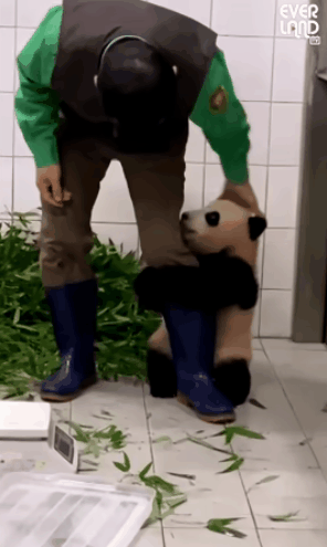 “福寶”抱著飼養(yǎng)員的腿撒嬌。(來(lái)源:愛(ài)寶樂(lè)園官方社交平臺(tái)賬號(hào))