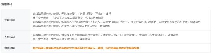 19日,記者瀏覽某在線旅游平臺的多個跟團游頁面,發(fā)現(xiàn)在預訂限制一欄中,會有年齡限制、人群限制和其他限制。但多是不接受孕婦預訂,并未有記者等職業(yè)限制。
