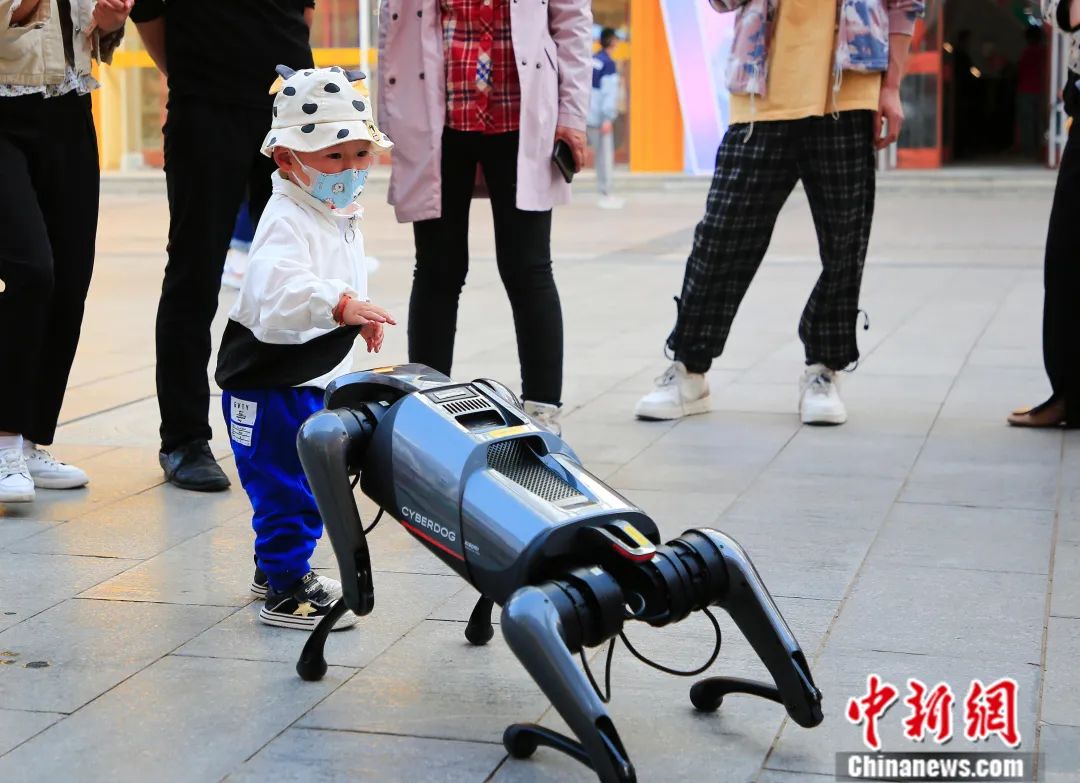 2022年4月9日,在寧夏銀川鼓樓步行街,一名小朋友與機(jī)器人“鐵蛋”互動。袁宏彥攝