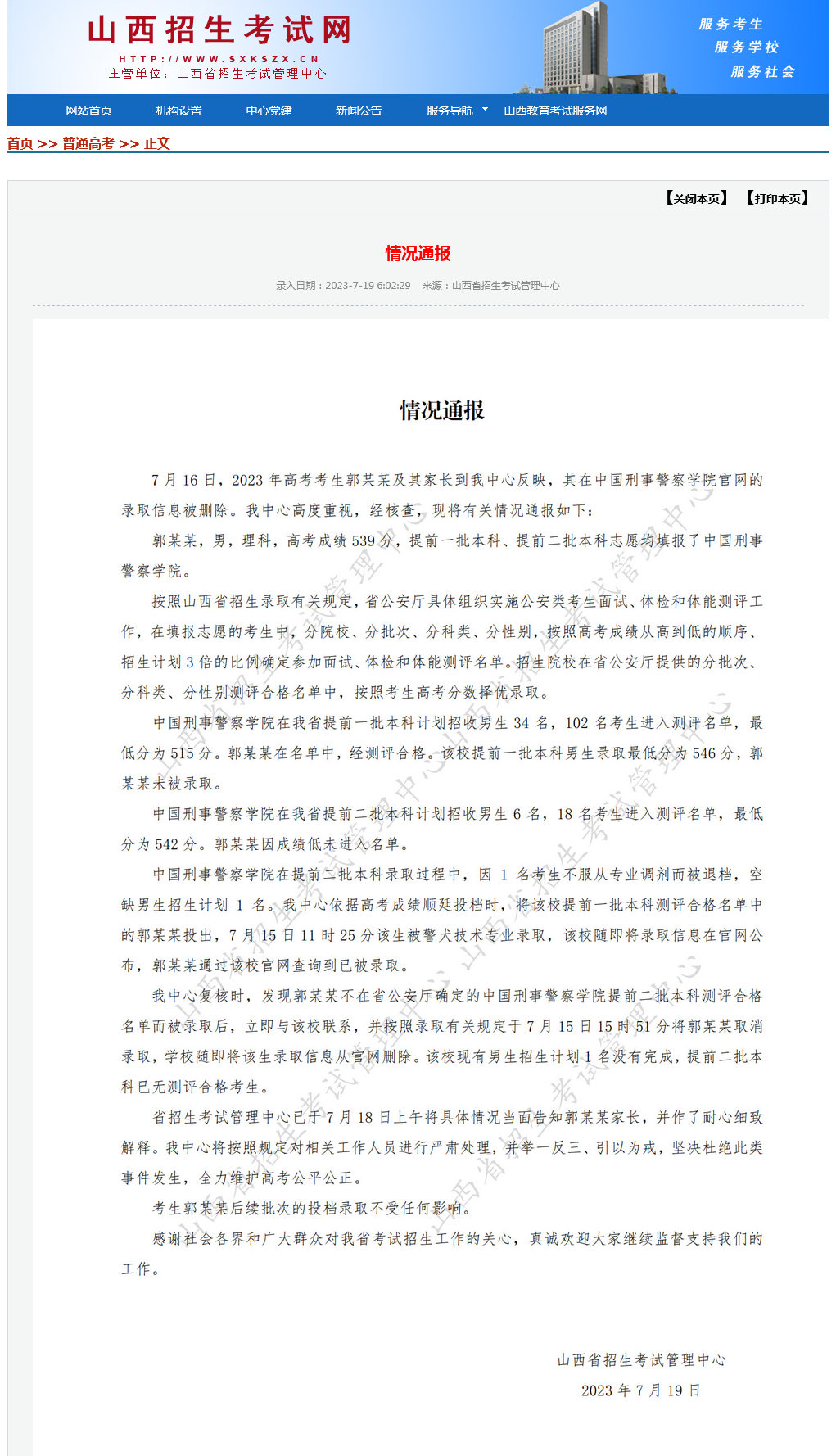 中新網(wǎng)7月19日電 據(jù)山西招生考試網(wǎng)消息,山西省招生考試管理中心19日發(fā)布情況通報(bào)稱,7月16日,2023年高考考生郭某某及其家長到該中心反映,其在中國刑事警察學(xué)院官網(wǎng)的錄取信息被刪除。該中心高度重視,經(jīng)核查,有關(guān)情況如下: