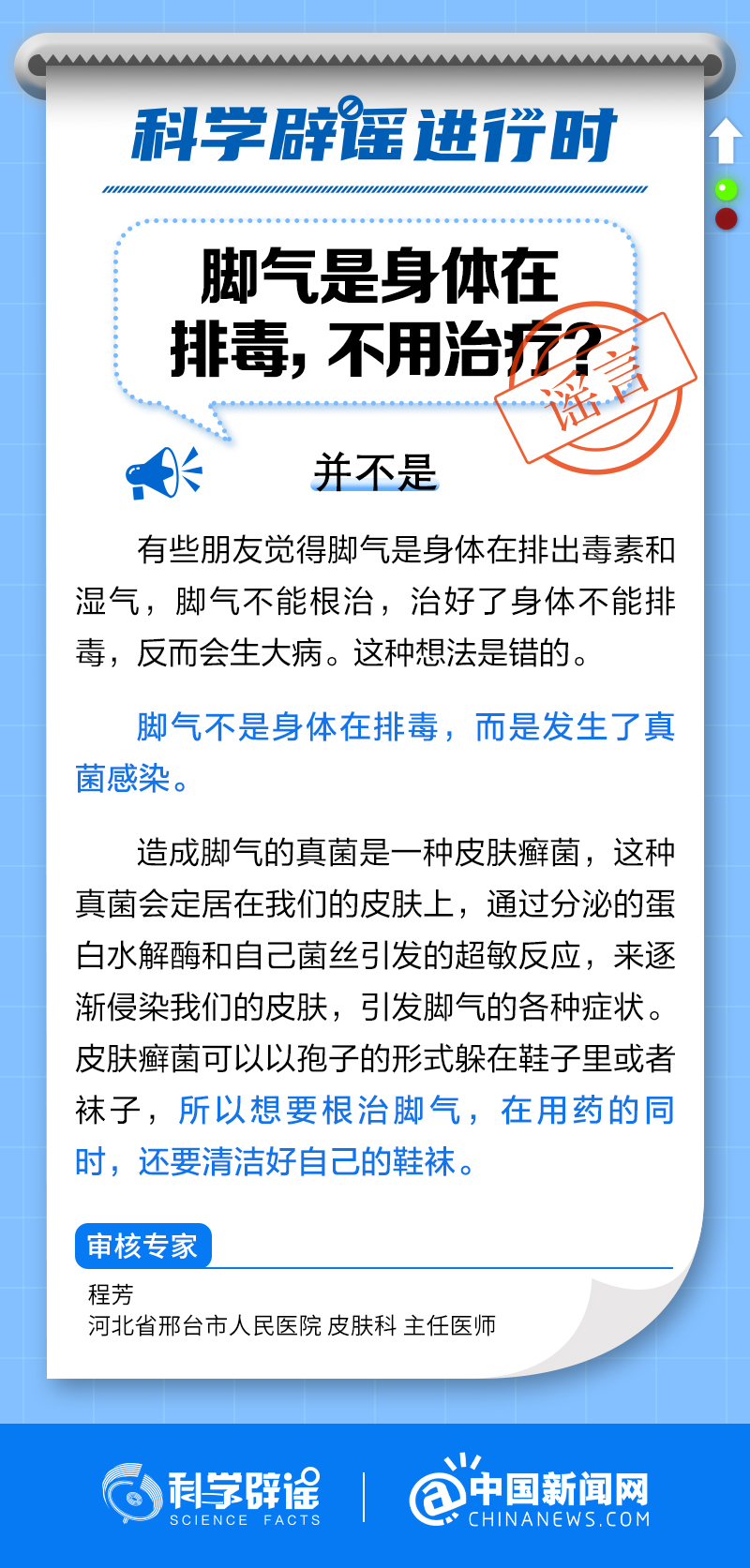 有些朋友覺得腳氣是身體在排出毒素和濕氣,腳氣治好了身體不能排毒,反而會生大病。這種想法是錯的!腳氣不是身體在排毒,而是發(fā)生了真菌感染。(來源:@科學(xué)辟謠 @中國新聞網(wǎng) )