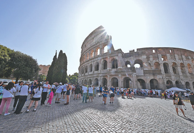 意大利首都羅馬7月18日最高氣溫超過41攝氏度,是今年以來(lái)當(dāng)?shù)刈罡邭鉁?。圖為當(dāng)天,游客聚集在羅馬斗獸場(chǎng)附近。