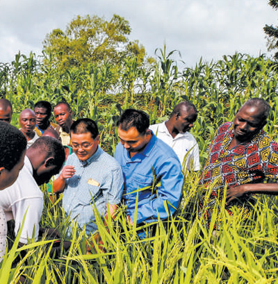 中國中化控股有限責任公司旗下荃銀高科的水稻專家在多哥示范田現(xiàn)場,為當?shù)剞r(nóng)民講解水稻抽穗揚花期的關鍵技術和田間管理要點。