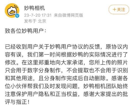 對(duì)此,妙鴨相機(jī)在7月20日回應(yīng)稱(chēng),原協(xié)議內(nèi)容有誤,并第一時(shí)間刪除了相關(guān)條款。