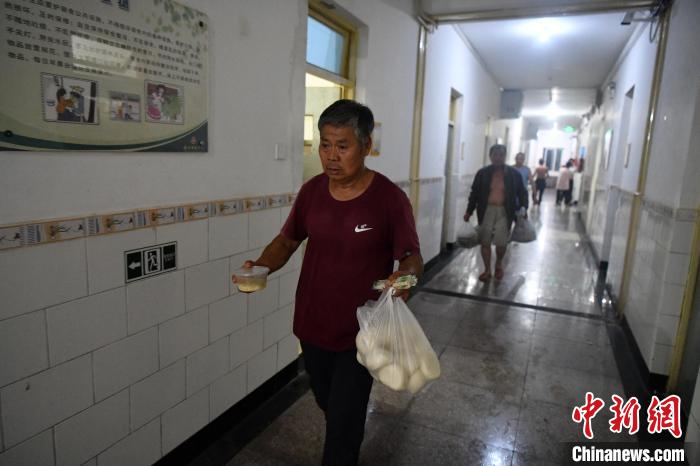 8月1日晚,在涿州市職業(yè)技術(shù)教育中心臨時(shí)安置點(diǎn),民眾剛領(lǐng)取晚飯?!≈行律缬浾?翟羽佳 攝