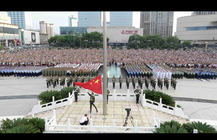 八月一號上午,全軍院?!皬娷姳毕盗斜荣惣薪涣髻?60余名官兵與南昌市相關(guān)代表集合在南昌八一廣場參加升旗儀式。 劉宇龍 攝