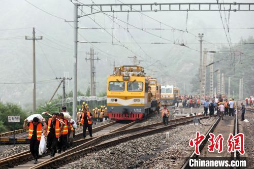 8月1日,北京門頭溝區(qū),豐沙鐵路妙峰山鎮(zhèn)水峪嘴村段,工作人員前往鐵路線清淤搶修。7月29日以來,北京地區(qū)持續(xù)強降雨,西南部降雨量大。受降雨影響,北京豐臺至沙城鐵路(豐沙線)嚴(yán)重水害?!≈行律缬浾?盛佳鵬 攝