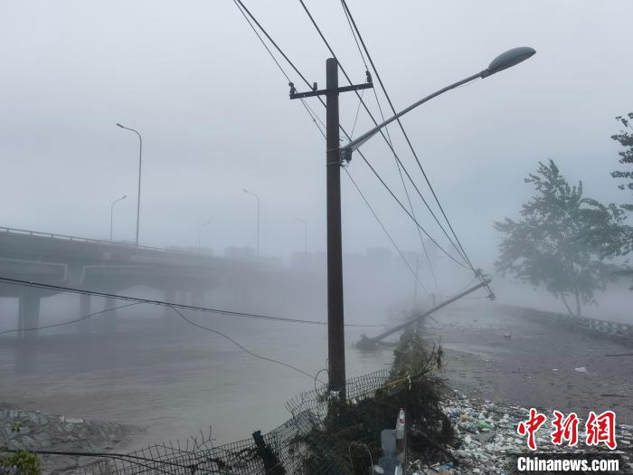 8月1日下午,在永定河京原漫水橋現(xiàn)場,武警北京總隊機動第三支隊200名官兵正在此處實施封堵作業(yè),以防止洪水漫溢,影響周邊百姓。圖為京原漫水橋上的一根電線桿已被洪流沖歪,各種雜物散落各處。中新社記者 劉亮 攝