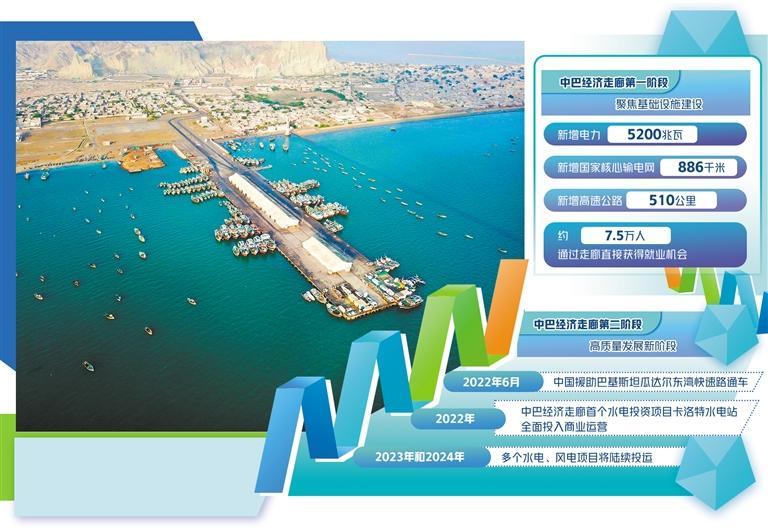 當(dāng)前正處于中巴經(jīng)濟走廊建設(shè)的第二階段,這也是至關(guān)重要的高質(zhì)量發(fā)展新階段。中巴雙方在走廊框架下,進一步加強巴國工業(yè)化進程、人力資源培訓(xùn)和產(chǎn)業(yè)園區(qū)建設(shè),在扶貧、醫(yī)療、農(nóng)業(yè)以及互聯(lián)網(wǎng)等眾多與民生息息相關(guān)的領(lǐng)域持續(xù)深化合作,力求創(chuàng)造更多就業(yè)機會,不斷推動巴基斯坦的經(jīng)濟和社會現(xiàn)代化發(fā)展,造福當(dāng)?shù)孛癖姟?022年6月,中國援助巴基斯坦瓜達爾東灣快速路通車,打通了瓜達爾港和卡拉奇之間的交通運輸通道。同年,中巴經(jīng)濟走廊首個水電投資項目——卡洛特水電站全面投入商業(yè)運營,每年將向巴基斯坦提供32億千瓦時廉價清潔電能,滿足當(dāng)?shù)?00萬人用電需求,每年可節(jié)約標準煤約140萬噸,減少二氧化碳排放350萬噸。今明兩年,走廊框架下的多個水電、風(fēng)電項目將陸續(xù)投運,未來巴基斯坦在清潔能源領(lǐng)域大有可為。