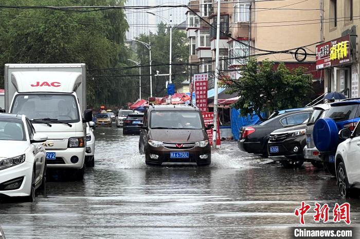 2日上午,車輛在哈爾濱市街路上冒雨行駛。趙宇航 攝