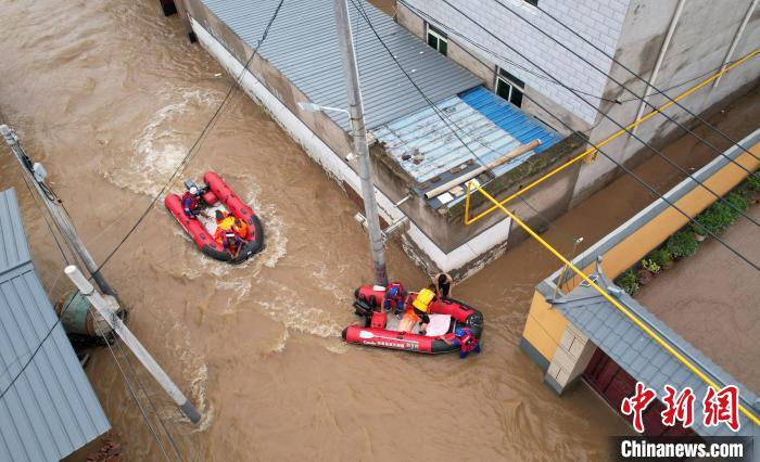 8月3日,藍天救援隊隊員在河北省涿州市刁窩鎮(zhèn)東馮村轉(zhuǎn)移村民。(無人機照片)中新社記者 翟羽佳 攝