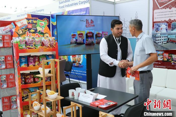 當?shù)貢r間8月3日,哈薩克斯坦阿斯塔納,阿富汗商品展當日啟幕。圖為阿富汗食品展商與哈顧客洽談?! ≈行戮W(wǎng)記者 張碩 攝