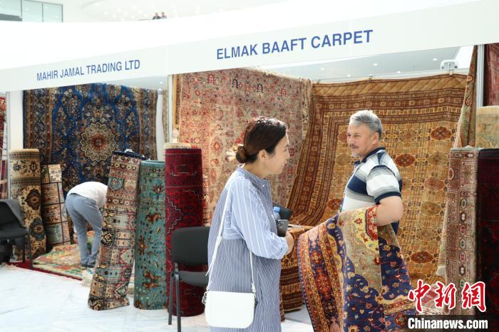 當?shù)貢r間8月3日,哈薩克斯坦阿斯塔納,阿富汗商品展當日啟幕。圖為展商向哈顧客展示阿富汗手工羊毛地毯?! ≈行戮W(wǎng)記者 張碩 攝