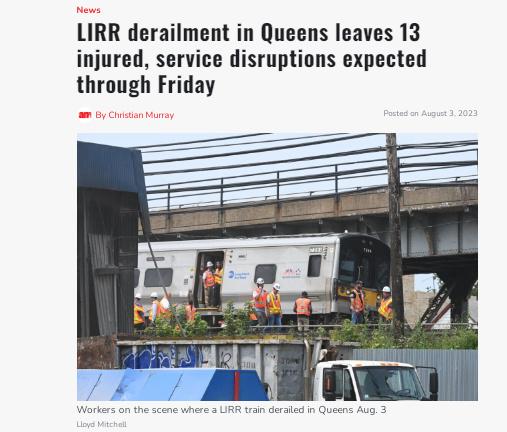 報(bào)道稱,當(dāng)?shù)毓賳T介紹,這列隸屬于長(zhǎng)島鐵路公司的火車從紐約市中央車站出發(fā),在行至皇后區(qū)牙買加車站附近時(shí)發(fā)生事故,所掛八節(jié)車廂全部脫軌。