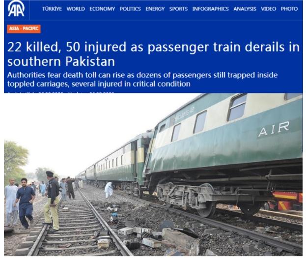 據(jù)報(bào)道,一名巴基斯坦南部信德省官員稱,當(dāng)天,從卡拉奇開往哈維連的一列客運(yùn)火車在信德省??藸柕貐^(qū)附近脫軌,有至少10節(jié)車廂沖出軌道。