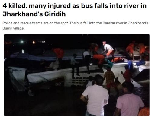 據(jù)報(bào)道,當(dāng)?shù)鼐椒Q,當(dāng)晚約20:40,在賈坎德邦(Jharkhand)的吉里迪(Giridih)縣,一輛從蘭契開往吉里迪的大巴車突然撞壞大橋欄桿,隨后墜入河流,橋梁高度約15米,造成至少4人死亡。預(yù)計(jì)還有幾人溺水身亡,救援行動(dòng)正在進(jìn)行中。