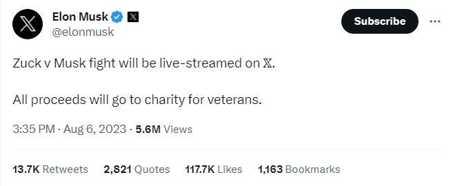 當(dāng)日晚些時(shí)候,扎克伯格在自家的社交平臺(tái)“Threads”上回應(yīng),“我已經(jīng)做好了準(zhǔn)備”,并說(shuō):“我們不應(yīng)該使用一個(gè)能真正籌措慈善資金的更可靠平臺(tái)嗎?”