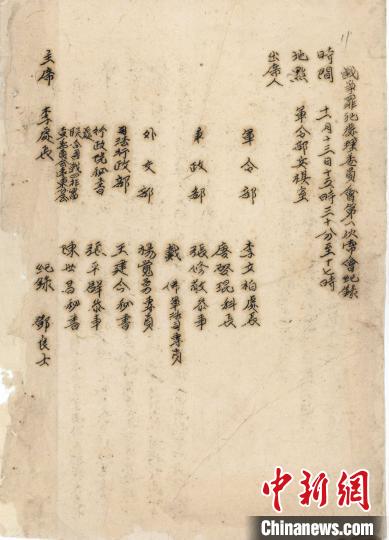 資料圖:戰(zhàn)爭(zhēng)罪犯處理委員會(huì)第一次常會(huì)記錄。民盟上海市委會(huì)供圖