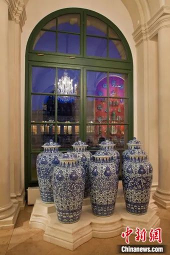 中國清朝時期的釉下藍色紀念性花瓶,即南部拱形長廊中的所謂龍騎兵花瓶。版權(quán)所有:德累斯頓國家藝術(shù)收藏館瓷器館藏。照片:Jürgen Lsel