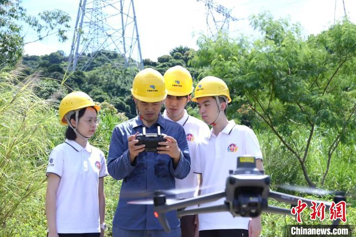 在南方電網(wǎng)公司深圳供電局實(shí)習(xí)的港澳臺(tái)大學(xué)生學(xué)習(xí)開(kāi)展無(wú)人機(jī)巡視作業(yè)。(南方電網(wǎng)供圖)