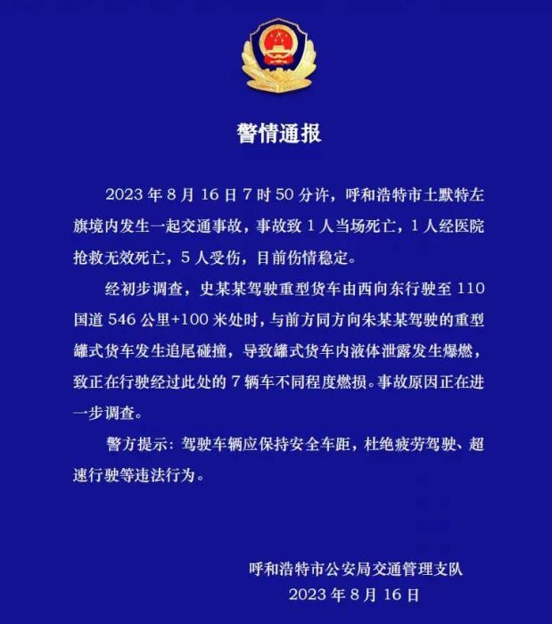 經(jīng)初步調(diào)查,史某某駕駛重型貨車(chē)由西向東行駛至110國(guó)道546公里+100米處時(shí),與前方同方向朱某某駕駛的重型罐式貨車(chē)發(fā)生追尾碰撞,導(dǎo)致罐式貨車(chē)內(nèi)液體泄露發(fā)生爆燃,致正在行駛經(jīng)過(guò)此處的7輛車(chē)不同程度燃損。事故原因正在進(jìn)一步調(diào)查。