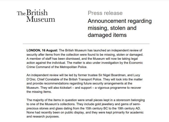 藏品丟失的具體時(shí)間沒(méi)有說(shuō)明,但據(jù)大英博物館董事會(huì)董事長(zhǎng)喬治·奧斯本表示,董事會(huì)成員在“今年早些時(shí)候”得知此事,非常擔(dān)憂(yōu)。