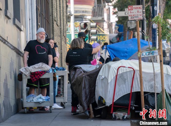 當(dāng)?shù)貢r(shí)間8月18日,慈善機(jī)構(gòu)救世軍組織的工作人員和志愿者在美國(guó)舊金山田德隆區(qū)街頭分發(fā)食物和衣服。中新社記者 劉關(guān)關(guān) 攝