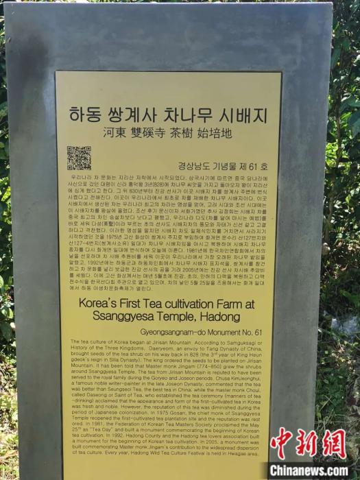 河?xùn)|雙溪寺韓國(guó)茶樹(shù)始培地碑刻。田杰 攝