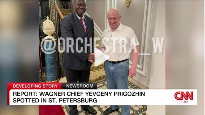 在圣彼得堡舉行的俄非峰會期間,“瓦格納”組織創(chuàng)始人普里戈任被拍到和與會非洲代表握手。(圖片來源:美國有線電視新聞網視頻截圖)
