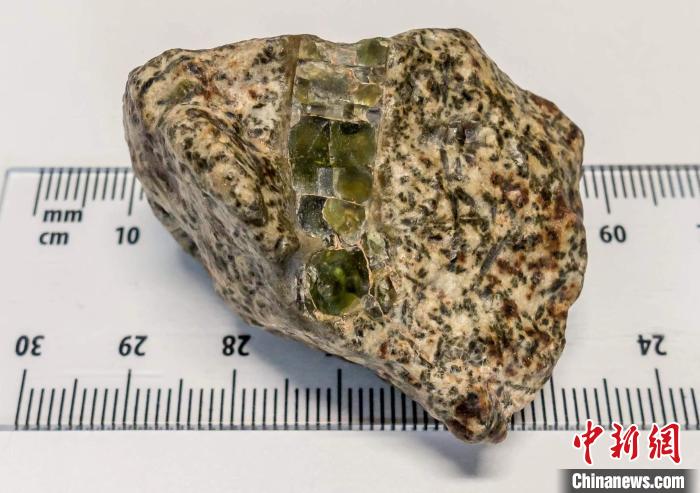 Erg Chech 002隕石樣本。該樣本約20毫米長,由斜長石(白色)和兩種輝石(深綠色和棕色)組成的基質(zhì)中鑲嵌著一塊大的輝石晶體(圖片來自Yuri Amelin)。施普林格·自然 供圖