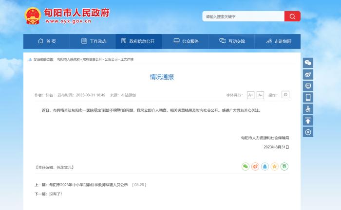 8月31日,據(jù)旬陽市人民政府網(wǎng)站發(fā)布情況通報,旬陽市人力資源和社會保障局已對此介入調(diào)查,相關調(diào)查結果及時向社會公開。