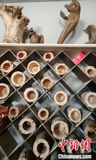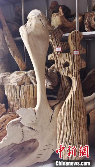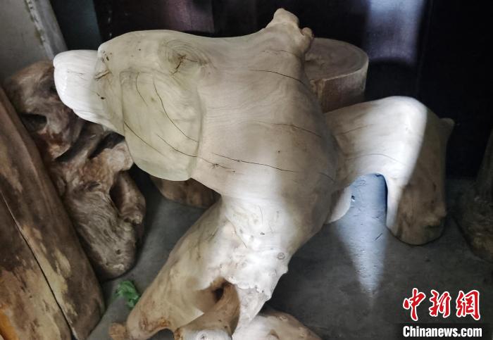 在位于新疆阿拉爾市的戴新根雕加工坊的大院內(nèi),擺放著一堆接一堆的各類待加工“材料”,從長二、三米的朽木、樹根,到僅有幾十厘米長的各種樹枝,至少能裝滿幾輛貨車。中新網(wǎng)記者注意到,偌大的廠房式加工“車間”內(nèi),各類正在加工的半成品約有幾十件。在左側(cè)相鄰的“車間”內(nèi),存放著20世紀(jì)70年代前后的字畫、木箱、電影放映機(jī)、音樂播放機(jī)……