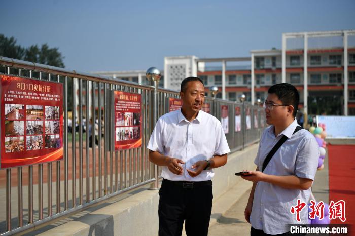 9月1日,涿州市刁窩中學(xué)校長(zhǎng)孫常見(jiàn)(左)向中新社記者講述“筑夢(mèng)路”背后的故事?!≈行律缬浾?翟羽佳 攝