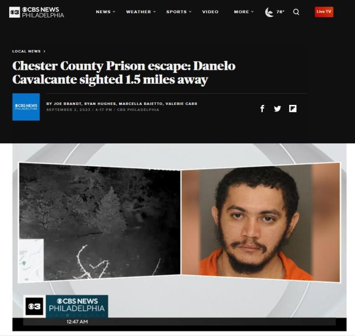 據(jù)報道,該犯人為34歲的達(dá)內(nèi)洛·卡瓦爾坎特。當(dāng)?shù)貢r間8月31日上午,他在等待被轉(zhuǎn)移至州監(jiān)獄時,從賓州費(fèi)城郊區(qū)的監(jiān)獄越獄,官方尚未透露其越獄的細(xì)節(jié)。