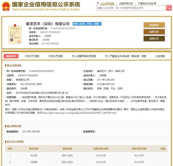 國家企業(yè)信用信息公示系統(tǒng)顯示,睿澤藝術(深圳)有限公司成立于2011年12月,法定代表人為馬珮雯,注冊資本600萬人民幣。公司由馬云亮、馬珮雯共同持股,馬云亮持股75%,為公司實控人。